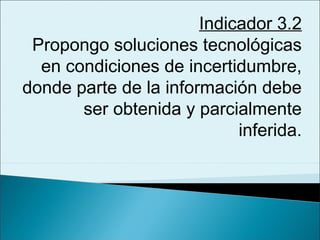 El documento describe la capacidad de proponer soluciones tecnológicas en condiciones de incertidumbre cuando parte de la información debe ser obtenida e inferida. Esto implica analizar críticamente un problema, identificar una solución tecnológica utilizando los recursos disponibles de manera eficiente, a pesar de la incertidumbre y la necesidad de inferir parte de la información requerida.