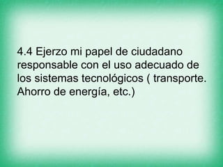 El documento habla sobre el uso adecuado de los sistemas tecnológicos. Explica que una tecnología debe ajustarse a los sistemas tecnológicos existentes en un país en términos de los insumos que requiere y los productos que genera. También señala que cuanto más se ajuste una tecnología a los sistemas en uso, mayor será su compatibilidad y eficiencia, y que los ambientes tecnológicos son dinámicos y tienden a evolucionar hacia tecnologías más productivas.