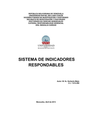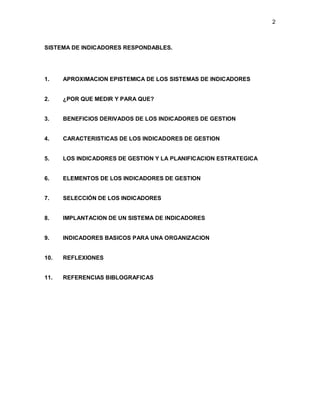 Este documento trata sobre los sistemas de indicadores de gestión y sus características. Explica que los indicadores miden el desempeño y los resultados de una gestión para evaluar el cumplimiento de los objetivos. Entre los beneficios de los indicadores se encuentran la mejora continua, el monitoreo de procesos y la satisfacción de clientes. El documento también describe elementos clave de los indicadores como su definición, objetivos, valores de referencia, responsabilidades y periodicidad. Finalmente, resalta la importancia de alinear los indicadores con la