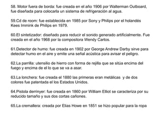 El documento describe varios inventos históricos como el gatillo de automóvil creado por Richard Dudgeon, el bolígrafo creado por Ladislao Biro, y el radioteléfono creado en 1387 para comunicaciones a larga distancia. También menciona otros inventos como el magnetófono, secador de cabello, motor fuera de borda, CD, sintetizador musical, y detector de humo.