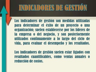 Los indicadores de gestión miden el éxito de un proyecto u organización y suelen establecerse por los líderes para evaluar el desempeño y resultados a lo largo del ciclo de vida. Generalmente están ligados a resultados cuantificables como ventas o costos. También buscan lograr objetivos al menor costo posible y siempre es posible definir un resultado esperado expresado como una meta o cantidad.