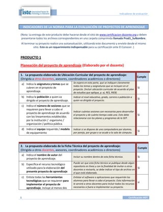 Este documento presenta indicadores para evaluar proyectos de aprendizaje. Contiene 5 secciones principales: 1) planeación del proyecto, 2) ficha técnica, 3) introducción, 4) actividades, y 5) evaluación. Cada sección incluye indicadores específicos que deben cumplirse para una correcta implementación y evaluación del proyecto de aprendizaje.