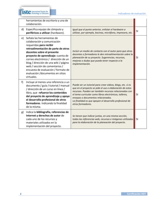 Este documento presenta indicadores para evaluar proyectos de aprendizaje. Incluye 5 secciones principales: 1) Ubicación curricular del proyecto, 2) Ficha técnica, 3) Introducción, 4) Actividades, y 5) Evaluación. Cada sección contiene indicadores específicos que deben cumplirse para una correcta planeación y desarrollo del proyecto de aprendizaje. El objetivo general es que el proyecto promueva el aprendizaje significativo de los estudiantes mediante el uso de herramientas te