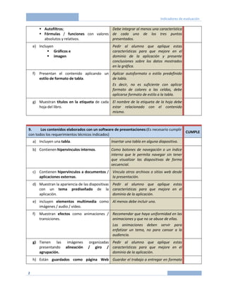 Este documento presenta una serie de indicadores de evaluación para evaluar contenidos elaborados con procesadores de texto, hojas de cálculo, presentaciones y herramientas de comunicación y colaboración. Los indicadores cubren aspectos como formato, elementos multimedia, hipervínculos, gráficos, estilos y guardado de archivos. El objetivo es que los estudiantes aprendan a utilizar las características de estas herramientas para mejorar el dominio de las mismas.