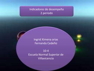El documento presenta los indicadores de desempeño del segundo periodo de Ingrid Ximena Arias y Fernanda Cedeño de la Escuela Normal Superior de Villavicencio. Incluye indicadores sobre la apropiación y uso de la tecnología, como el diseño de planes de mantenimiento de artefactos tecnológicos, la investigación de procesos de producción y manufactura, el uso adecuado de herramientas informáticas y el cumplimiento de normas de seguridad.
