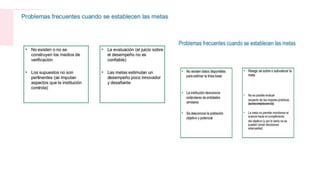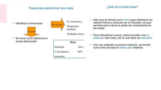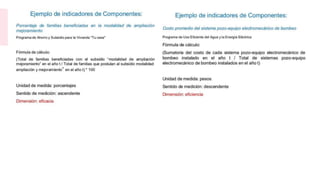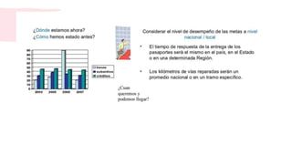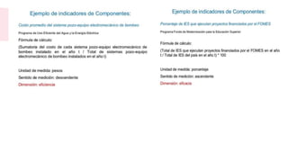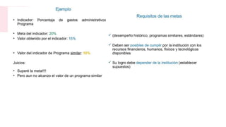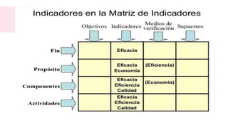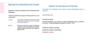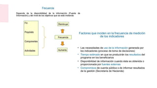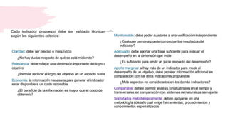 El documento explora la definición y construcción de indicadores, destacando su papel en la evaluación del progreso hacia objetivos específicos. Se clasifica los indicadores según sus dimensiones de desempeño como eficacia, calidad, eficiencia y economía, y se detalla el proceso para formularlos y validarlos. Se enfatiza la importancia de los indicadores en la toma de decisiones para mejorar procesos y resultados.