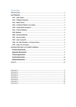 El documento proporciona una historia de los principales pioneros en el desarrollo de la computación, desde los primeros dispositivos mecánicos para contar como el ábaco hasta las primeras computadoras modernas. Entre los pioneros más destacados se encuentran Charles Babbage, considerado el "padre de las computadoras" por su trabajo en el Motor Analítico, y Howard Aiken, quien propuso crear una de las primeras computadoras modernas basada en el diseño de Babbage. El documento también describe las cinco generaciones de computadoras desde