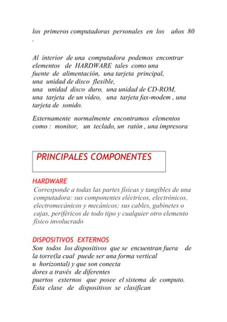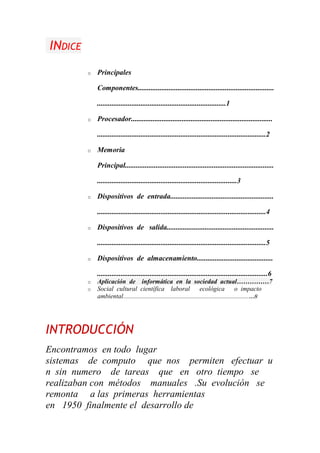 El documento describe los principales componentes de una computadora, incluyendo el procesador, memoria, dispositivos de entrada y salida, y almacenamiento. También discute las aplicaciones de la computación en la sociedad en ámbitos sociales, culturales, científicos y laborales, así como sus impactos ambientales.