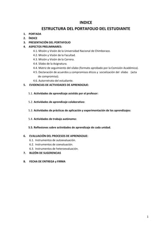 Este documento presenta la estructura propuesta para el portafolio del estudiante. Contiene 8 secciones principales: 1) Portada, 2) Índice, 3) Presentación del portafolio, 4) Aspectos preliminares, 5) Evidencias de actividades de aprendizaje, 6) Evaluación del proceso de aprendizaje, 7) Buzón de sugerencias, y 8) Fecha de entrega y firma. La sección 4 incluye la misión y visión de la universidad, facultad, carrera y el sílabo de la