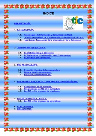 Este documento trata sobre las nuevas tecnologías de la información y la comunicación (TIC) en la educación. Explica conceptos como TICs, NTICs y su impacto en la educación. También describe la evolución histórica de las computadoras, el papel de las TIC en los procesos de enseñanza y aprendizaje, y la importancia de capacitar a los docentes en el uso de estas tecnologías. Finalmente, analiza cómo las TIC están transformando la sociedad en una sociedad de la información y el conocimiento.