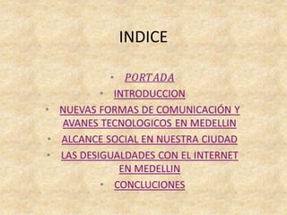 Este documento resume los avances y desafíos de las telecomunicaciones en Medellín, Colombia. Explica que el acceso a banda ancha se está expandiendo rápidamente debido a las necesidades de comunicación de empresas e individuos. Sin embargo, existen desigualdades significativas, ya que los servicios son caros y las empresas priorizan las ganancias sobre la cobertura. Aunque Medellín ha progresado, todavía le falta alcanzar los niveles de otros países en términos de acceso universal a comunicaciones asequibles y de alta veloc