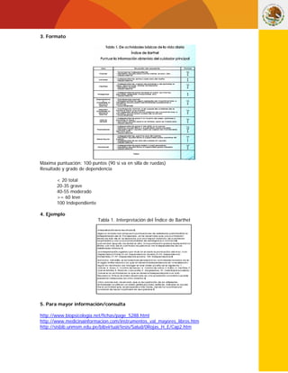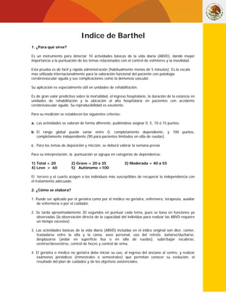 El Indice de Barthel es una escala utilizada para evaluar la capacidad funcional de pacientes con accidentes cerebrovasculares u otras patologías. Mide 10 actividades básicas de la vida diaria como comer, vestirse, bañarse y control de esfínteres. Se puntúa de 0 a 100 puntos, donde valores menores a 20 indican dependencia total y valores mayores a 60 dependencia leve. El índice puede ser aplicado por médicos o personal de enfermería en menos de 5 minutos y es útil para predecir resultados y necesidad de rehabilitación