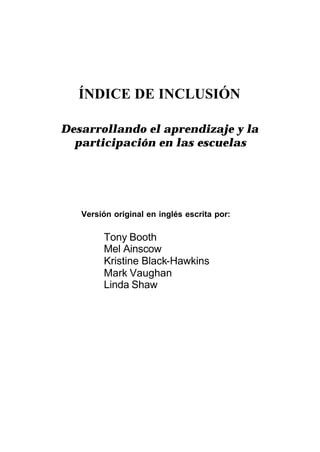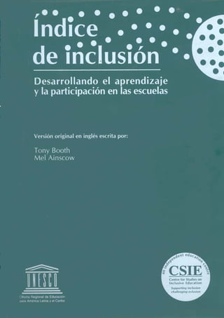 El documento presenta el Índice de Inclusión, un conjunto de materiales diseñados para apoyar a las escuelas en el proceso de avanzar hacia una educación inclusiva. El objetivo es construir comunidades escolares colaborativas que promuevan altos niveles de logro en todo el alumnado. El proceso implica la constitución de un grupo de coordinación que trabaja con la escuela para analizar los aspectos que generan barreras de aprendizaje, identificar prioridades y definir planes de desarrollo e inclusión.