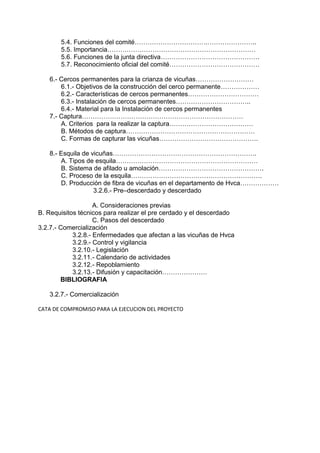 El documento describe el contexto, estructura y población de vicuñas en el departamento de Huancavelica, Perú. Incluye secciones sobre la ubicación y descripción física de la región, su historia y política. También cubre temas como la construcción de cercos para crianza de vicuñas, la captura y esquila de las mismas, y la formación de comités comunales para el uso sostenible de camélidos silvestres. Finalmente, presenta un calendario de actividades para la gestión y protección de la p