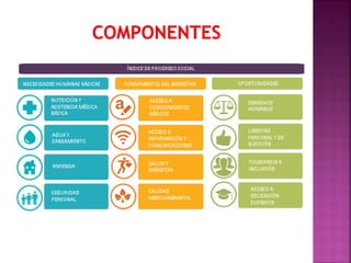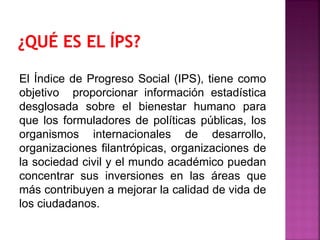 El documento describe el Índice de Progreso Social (IPS), una herramienta que recopila datos estadísticos sobre el bienestar humano de países para guiar las inversiones en áreas que mejoran la calidad de vida. El IPS analiza información de 50 países y se expandirá a más de 100. Mide 52 indicadores en tres áreas (necesidades humanas básicas, bienestar básico y oportunidades) para comparar el desempeño de países y guiar discusiones sobre prioridades. En su primer año, los tres mejores lugares fuer