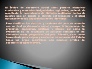 El Índice de desarrollo social (IDS) permite identificar desigualdades regionales en el acceso al bienestar y capacidades en Costa Rica. El IDS clasifica distritos y cantones según su nivel de desarrollo social para formular proyectos, programas y políticas, y asignar recursos a las áreas menos desarrolladas. El IDS se calcula a partir de 11 índices socioeconómicos basados en estadísticas públicas, estandarizados en una escala de 100 a 0, donde 100 indica los mejores indicadores