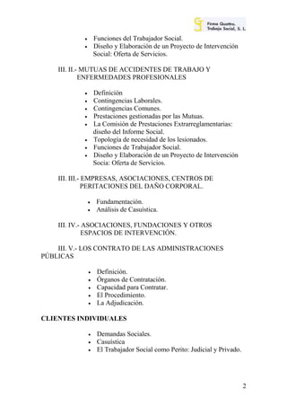 Este documento presenta un índice detallado de los seis capítulos de un libro sobre cómo establecer un negocio como trabajador social independiente. El capítulo uno cubre el marco legal y opciones jurídicas. El capítulo dos ofrece consejos para ser emprendedor. El capítulo tres explora áreas y sectores donde los servicios pueden dirigirse. El capítulo cuatro trata sobre la documentación requerida. El capítulo cinco analiza la ética en la práctica independiente. El capítulo seis cubre cómo contratar servicios,