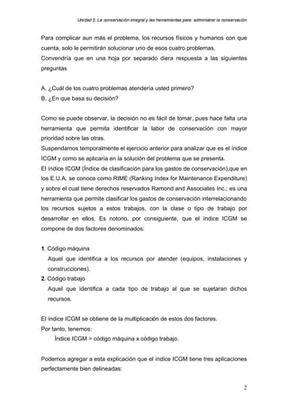 Este documento presenta el Índice ICGM (Índice de Clasificación para los Gastos de Conservación), una herramienta que permite clasificar y priorizar los trabajos de conservación de una empresa. Explica cómo el índice ICGM se compone de dos factores: el código máquina, que identifica los recursos de la empresa, y el código trabajo, que identifica los diferentes tipos de trabajos de conservación. También describe el proceso de aplicar el índice ICGM de forma simplificada en una empresa para resolver problemas de conservación de manera