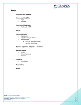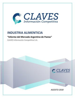 Este informe analiza la industria argentina de pastas en agosto de 2018. Cubre temas como la producción de trigo y pastas, precios, comercio exterior, régimen impositivo, mercado laboral, empresas e inversiones. La producción de pastas secas creció un 4,5% interanual mientras que las pastas frescas cayeron un 2,5%. Las exportaciones de pastas aumentaron principalmente a Brasil, Chile y Estados Unidos.