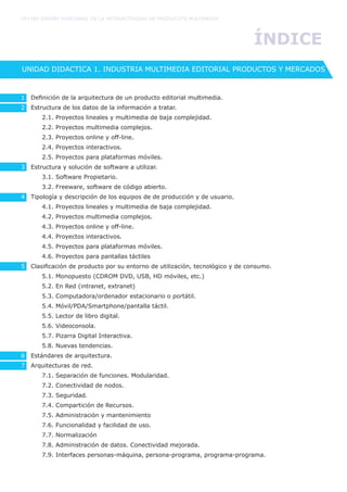 Este documento presenta una introducción a la industria multimedia editorial y productos. Se describe la estructura de datos de la información, las soluciones de software y hardware, y la clasificación de productos según su entorno y tecnología. También cubre estándares de arquitectura, arquitecturas de red, software e información, y plataformas para garantizar la interoperabilidad de los productos multimedia.