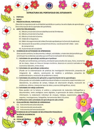 Este documento describe la estructura estándar de un portafolio de estudiante, incluyendo una portada, índice, presentación, aspectos preliminares del curso, evidencias de actividades de aprendizaje como trabajos individuales y colaborativos, reflexiones, evaluación del progreso y anexos. El portafolio tiene como objetivo documentar y certificar el aprendizaje del estudiante a lo largo del curso.