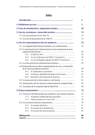 Este documento analiza la evolución del turismo en Gran Canaria desde su introducción hasta la actual etapa de madurez. Identifica cinco factores clave que han contribuido a la pérdida de competitividad del destino: 1) intervención excesiva del gobierno en el mercado, 2) falta de renovación de infraestructuras, 3) falta de diversificación de la oferta de ocio, 4) falta de desarrollo de nuevos productos turísticos, y 5) falta de innovación. El documento concluye examinando posibles escenarios futuros para