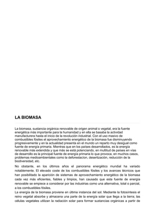 Este documento describe los diferentes tipos de biomasa, sus características energéticas y las aplicaciones para generar energía térmica, eléctrica y mecánica. La biomasa puede clasificarse como biomasa natural, residual seca o húmeda, cultivos energéticos o biocarburantes. Se puede generar energía térmica mediante combustión o energía eléctrica a través de ciclos de vapor, turbinas de gas o motores alternativos. La cogeneración permite producir energía térmica y eléctrica de forma conjunta