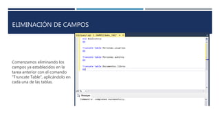 El documento describe la modificación de tablas en una base de datos, incluyendo la eliminación de campos y la adición de índices y restricciones. Se establecen índices agrupados y no agrupados en las tablas de usuarios, autores y libros, junto con constraints como default, llave foránea y check. Finalmente, se menciona el proceso de volver a llenar las tablas después de realizar los cambios.