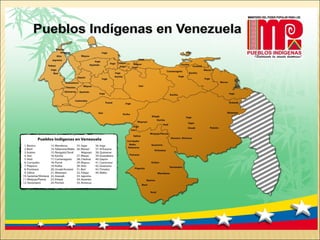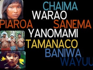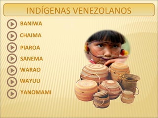 Este documento presenta información sobre 7 grupos indígenas venezolanos: los Baniwa, Chaima, Piaroa, Sanema, Warao, Wayuu y Yanomami. Brevemente describe la ubicación geográfica, población y algunas características culturales de cada grupo, como su idioma y territorio ancestral.