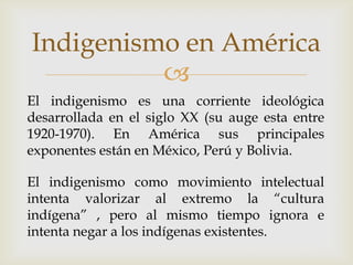 El documento resume el indigenismo como una corriente ideológica del siglo XX que intentó valorizar la cultura indígena pero también ignoró a los indígenas existentes. Tuvo influencia en las artes de México y Bolivia. Las políticas indigenistas buscaban integrar a los indígenas pero también asumían que podían "salvarlos". Se clasifican en político, comunitario, desarrollista y antropológico. Recientemente los indígenas se han levantado para exigir sus derechos, como en el levantamiento