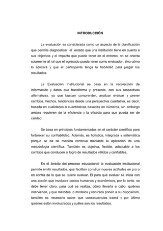 El documento describe los diferentes tipos de evaluación institucional, incluyendo la evaluación externa e interna. La evaluación externa mide el cumplimiento de objetivos y es realizada por entes externos, mientras que la evaluación interna mide el rendimiento académico y desempeño docente. Ambas evaluaciones usan indicadores para medir la calidad educativa y mejorar los procesos institucionales.