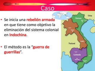 El documento analiza la rebelión armada en Indochina que buscaba eliminar el colonialismo francés y se basaba en tácticas de guerra de guerrillas. Destaca las causas de la resistencia, la influencia del pensamiento maoísta, así como las consecuencias que llevaron a la independencia de la región y la adopción de estructuras comunistas. El desenlace clave fue la victoria en la batalla de ðiện biên phủ y la firma del tratado de ginebra en 1954, que expandió el régimen comunista en la región.
