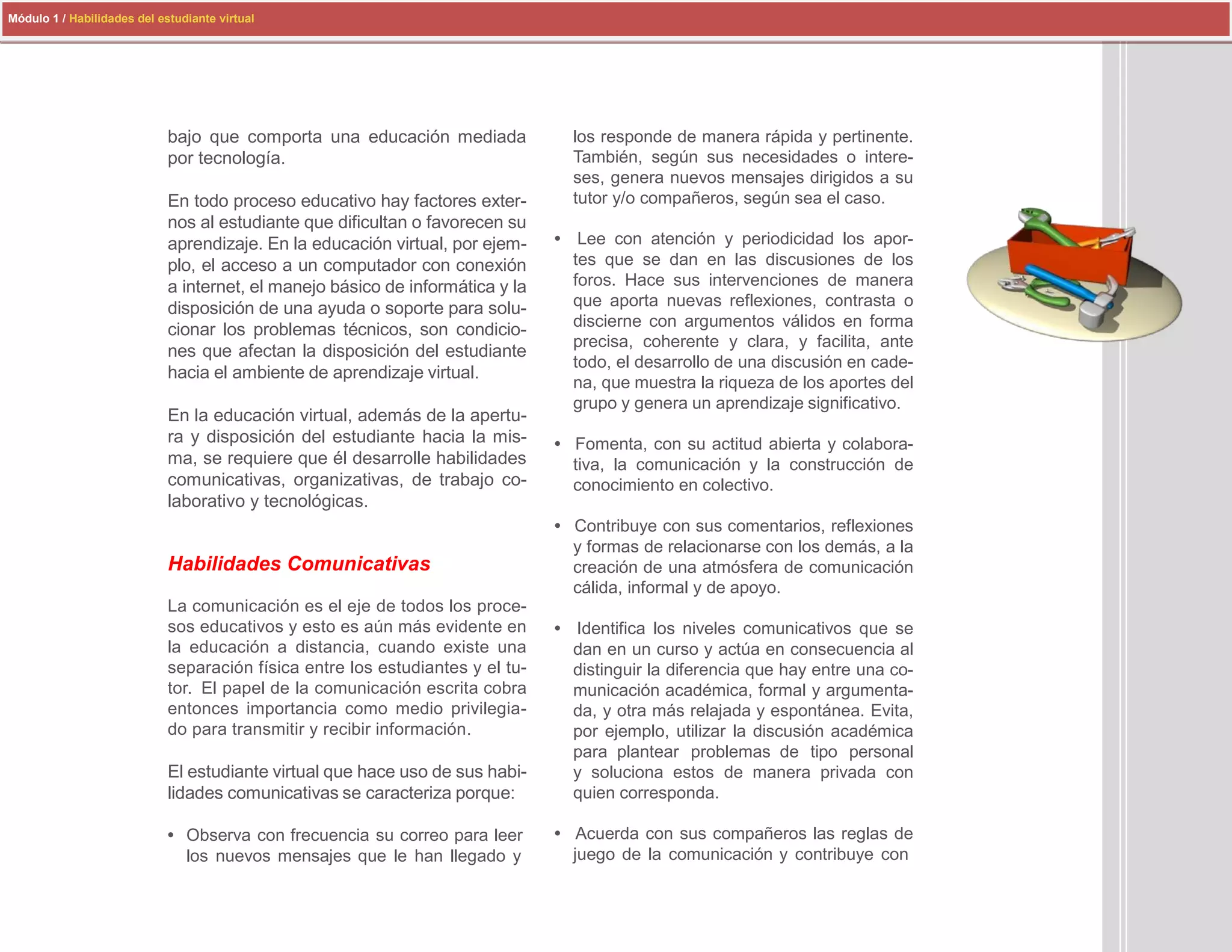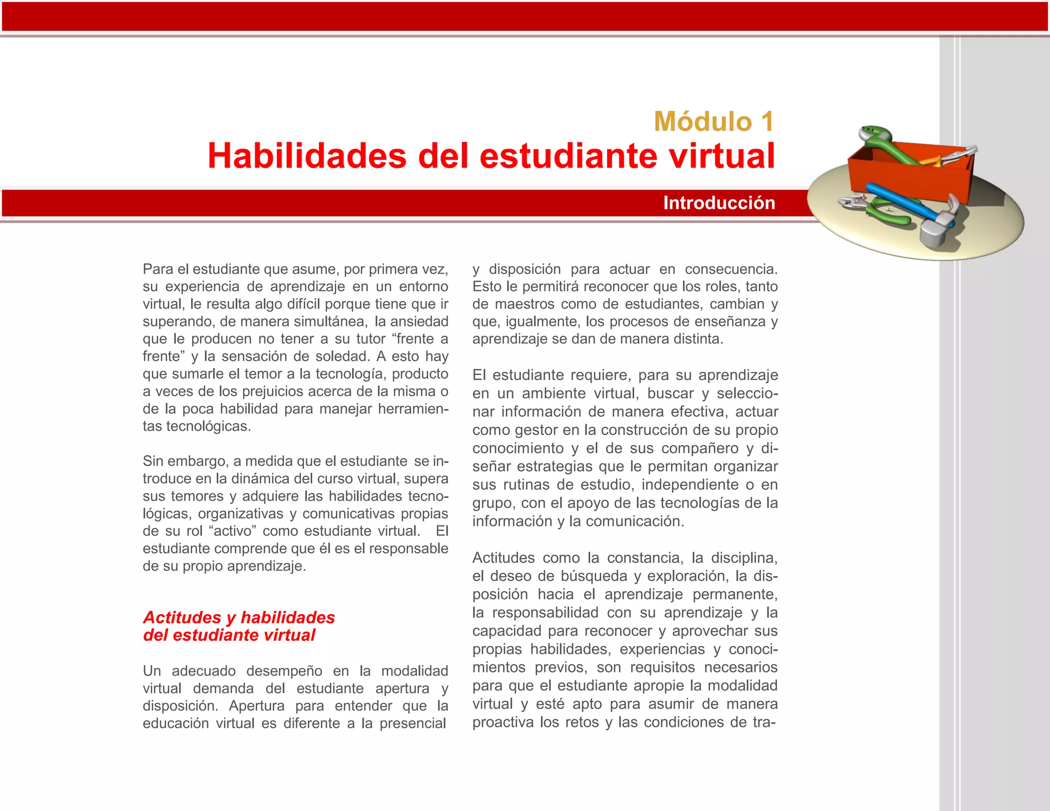 El documento presenta las habilidades necesarias para que un estudiante virtual asuma su rol en un entorno de aprendizaje en línea, destacando la importancia de la comunicación, la organización y el trabajo colaborativo. Se enfatiza que el estudiante debe ser proactivo y responsable en su propio proceso educativo, adaptándose a las condiciones únicas de la educación virtual. Además, se abordan las habilidades tecnológicas requeridas para navegar y aprovechar efectivamente los recursos disponibles en el aula virtual.