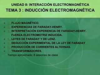 1) La inducción electromagnética ocurre cuando hay una variación del flujo magnético a través de un circuito, lo que genera una corriente inducida cuya dirección se opone al cambio que produce dicha variación, según la ley de Lenz.
