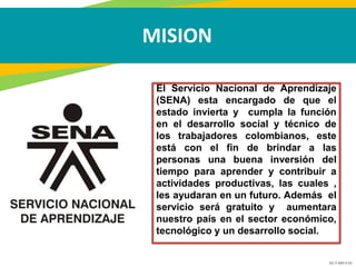 El documento describe la misión y visión del Servicio Nacional de Aprendizaje (SENA) de Colombia, el cual tiene el objetivo de brindar capacitación técnica y desarrollo social a los trabajadores colombianos. También justifica la importancia de fortalecer las habilidades de los instructores para guiar procesos de formación de calidad, centrados en desarrollar competencias a través de proyectos y técnicas didácticas activas.