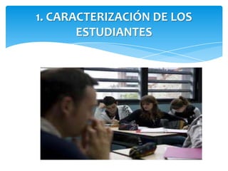 Este documento presenta la caracterización de los estudiantes en tres secciones. La primera sección describe las características demográficas, académicas y de desarrollo cognitivo de los estudiantes. La segunda sección presenta un modelo de plan de formación, incluyendo ejemplos de estudiantes y las responsabilidades del docente. La tercera sección describe un plan de mejoramiento para un estudiante específico con objetivos de mejorar su conocimiento, análisis y autoestima.