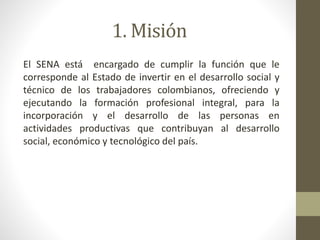 El documento describe la misión y visión del SENA, que busca ofrecer formación profesional para contribuir al desarrollo de Colombia. También explica los símbolos de la bandera y logotipo del SENA, así como el himno de la institución. Además, define los roles del aprendiz y tutor en la modalidad virtual y los servicios de bienestar para aprendices, incluyendo salud, deporte y cultura. Por último, detalla las funciones del sistema SOFIA PLUS para administración y del LMS Blackboard para el aprendizaje.