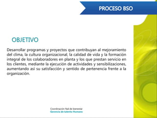 El documento presenta la información sobre el programa de bienestar de una organización (BSO). El objetivo del programa es desarrollar actividades que contribuyan al mejoramiento del clima organizacional y la calidad de vida de los colaboradores. El programa incluye actividades como celebraciones de cumpleaños y fechas especiales, convenios con universidades y entidades financieras, y programas de salud y recreación.