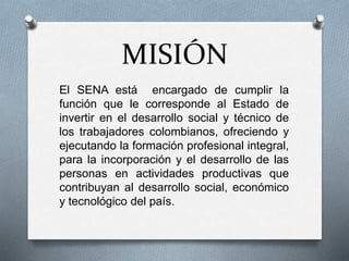 El documento describe la misión, visión, escudo, logotipo y roles del SENA (Servicio Nacional de Aprendizaje) de Colombia. La misión del SENA es ofrecer formación profesional para apoyar el desarrollo social, económico y tecnológico del país. Su visión para el 2020 es ser una institución líder mundial en formación profesional que contribuya a la competitividad de Colombia a través de la productividad, el empleo, la innovación y la calidad. El documento también explica los nueve componentes estrat