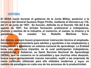 El SENA fue creado en 1957 para brindar formación profesional a trabajadores colombianos. Su misión es ofrecer formación integral para contribuir al desarrollo social, económico y tecnológico del país. Su visión es ser una entidad líder en formación profesional e innovación para aumentar la competitividad de Colombia a través de aportes a la productividad, empleo, fuerza laboral innovadora y excelencia en gestión. El SENA también busca el bienestar de los aprendices a través de programas de salud, deport
