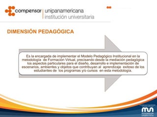 El documento describe la dimensión pedagógica para el desarrollo de contenidos y objetos de aprendizaje para la formación virtual. Promueve la autonomía, autorregulación y autogestión del estudiante a través de evidencias de conocimiento, desempeño y productos. Se basa en la interacción multidireccional entre actores, ambientes virtuales y materiales, con el facilitador estimulando el aprendizaje autónomo y el desarrollo de competencias a través de didácticas activas como estudios de casos, simulaciones y proyect