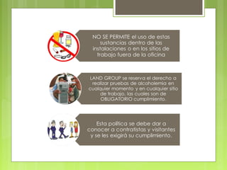 El documento presenta la política de seguridad y salud ocupacional de LAND GROUP & CO S.A.S. La política se basa en prevenir riesgos, mejorar continuamente, cumplir requisitos legales y reducir el consumo de agua y energía. Se describen los principales riesgos en la empresa y las medidas implementadas para prevenirlos, como capacitaciones, señalización e inspecciones.