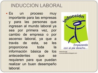 El documento describe estrategias de intervención organizacional como la inducción laboral para mejorar la productividad, disminuir la rotación y alcanzar objetivos. Explica que la inducción es un proceso para incorporar nuevos trabajadores dándoles información sobre la empresa y su trabajo. También describe objetivos, etapas, indicadores y métodos comunes de inducción.