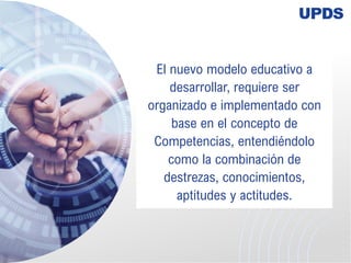 Este documento describe el modelo educativo basado en competencias de la UPDS. Explica que este modelo se centra en desarrollar competencias en los estudiantes que les permitan sobrevivir en un mundo en constante cambio. Define competencia como la combinación de destrezas, conocimientos, aptitudes y actitudes. También describe los componentes clave de los proyectos formativos, como el problema a resolver, los criterios de evaluación y las evidencias, así como las fases para implementarlos.