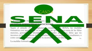 Este documento describe las medidas formativas y sanciones que puede imponer el SENA a los aprendices. Las medidas formativas incluyen llamados de atención verbales, planes de mejoramiento académico y planes de mejoramiento disciplinario. Las sanciones pueden ser llamados de atención escritos, condicionamiento de matrícula o cancelación de matrícula por faltas graves. El documento también menciona que el SENA ofrece estímulos como menciones de honor o pasantías nacionales e internacionales.