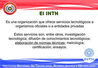 Este documento describe el proceso de elaboración de normas técnicas paraguayas y el rol del Instituto Nacional de Tecnología y Normalización (INTN) en la normalización nacional. El INTN coordina los comités técnicos de normalización que elaboran los proyectos de norma. Las normas pasan por un proceso de consulta pública y revisión antes de ser homologadas por el Ministerio de Industria y Comercio y publicadas oficialmente. El INTN busca armonizar las normas paraguayas con estándares internacionales para facilitar