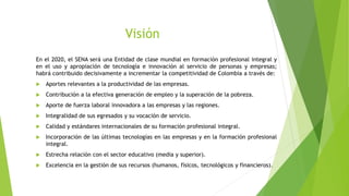 El documento presenta información sobre el Servicio Nacional de Aprendizaje (SENA) de Colombia. El SENA tiene la misión de ofrecer formación profesional integral a los trabajadores colombianos para contribuir al desarrollo social, económico y tecnológico del país. Su visión es convertirse en una entidad líder mundial en formación profesional e innovación para 2020. También describe sus símbolos como el escudo, la bandera y el himno, así como aspectos clave de la formación como los roles del tutor y el aprendiz.