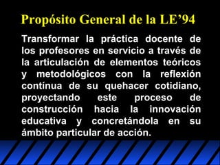 Este documento presenta la Licenciatura en Educación 1994 de la UPN. El propósito general es transformar la práctica docente a través de la articulación entre lo teórico y la reflexión de la práctica cotidiana. El plan de estudios incluye dos áreas, una común con tres líneas de formación y una específica. El primer curso del eje metodológico busca que los profesores identifiquen sus saberes para innovar su práctica a través de la sistematización.
