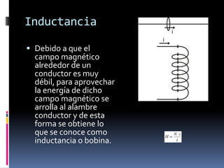 La inductancia se produce al arrollar un alambre conductor para aprovechar la energía del campo magnético, y su valor depende de la inductancia, el campo magnético y la corriente. La capacitancia es la oposición de un circuito a cambios en el voltaje y se origina en el campo electrostático, mientras que la inductancia se opone a cambios en la corriente y se origina en el campo magnético. La capacitancia de un capacitor depende de la carga almacenada y la tensión aplicada entre sus placas.