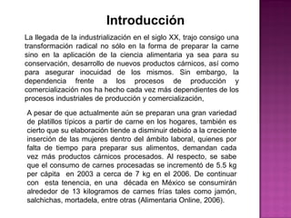 La industrialización de la carne de cerdo ha traído cambios en la forma de preparar y conservar la carne, aplicando ciencia alimentaria. Aunque aún se preparan platillos tradicionales en hogares, su elaboración disminuye debido a que más mujeres trabajan y demandan productos procesados. Existen empresas que se dedican a producir solo cortes primarios y otras que agregan valor con productos como embutidos, jamones y salchichas investigando tendencias de consumidores. La industria del cerdo es atractiva dado las tendencias mundiales y